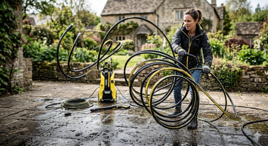 • クセの強い高圧ホースを狭い洗面所で丸める